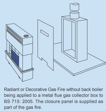 For double wall metal flue systems a substitute fireplace recess is conveniently available in the form of a metal flue collector box which must conform to BS 715:2005. Alternatively, starter or recess units of concrete block systems complying with BS EN 1858 can be used. These may require a special attachment to the closure plate to prevent flue gas impingement directly onto the blocks. The gas fire installation instructions will give details of any special requirements.